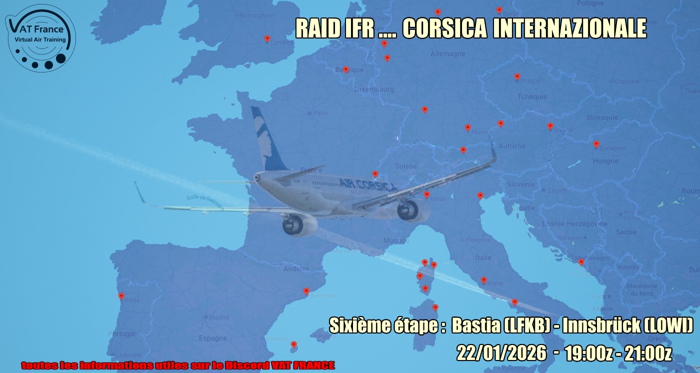 Le jeudi 22 Janvier 2026, nous volerons la sixième étape du raid IFR à bord des avions de AIR CORSICA pour effectuer la liaison régulière pour Innsbrück (LOWI) desservie par la compagnie à l'international au départ de Bastia (LFKB) . Rendez vous au Parking de Poretta et sur le teamspeak de VAT FRANCE. Rendez vous au Parking de Sainte Catherine et sur le teamspeak de VAT FRANCE. |