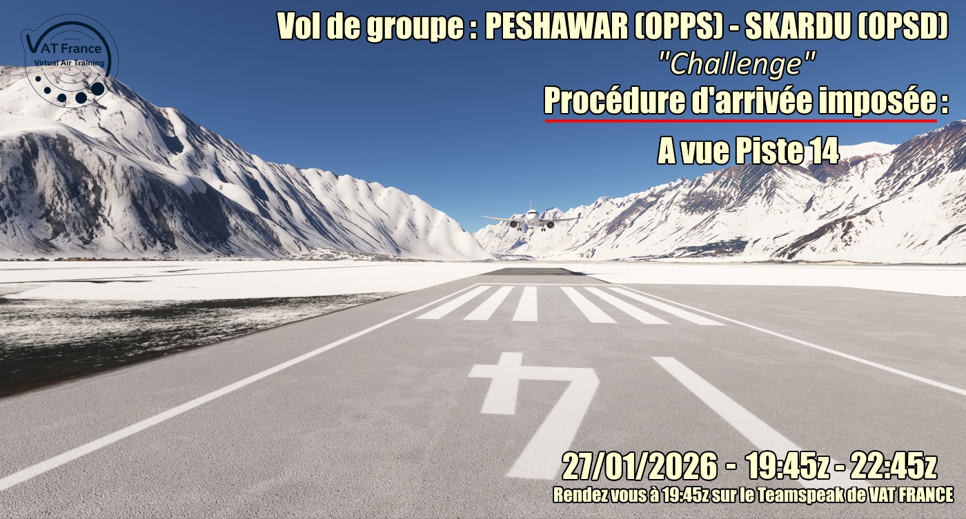 Le mardi tous les 15 jours VATFRANCE vous propose un défi d'approche imposée. Le 27 Janvier 2026 après la dernière arrivée effectuée sur Gilgit, nous vous proposons une liaison entre Peshawar (OPPS) et Skardu (OPSD) au Pakistan avec une arrivée imposée à vue sur la piste 14. Préparez vous à une arrivée difficile entre les montagnes sur une piste à 7300 pieds d'altitude. Prenez l'avion qui vous permettra de vous poser et rendez vous sur le teamspeak de VAT France. le réseau sera choisi au départ du vol. |
